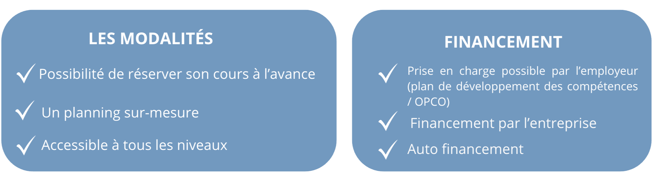 • Deux séances par semaine, d’une durée d’1h30 chacune.